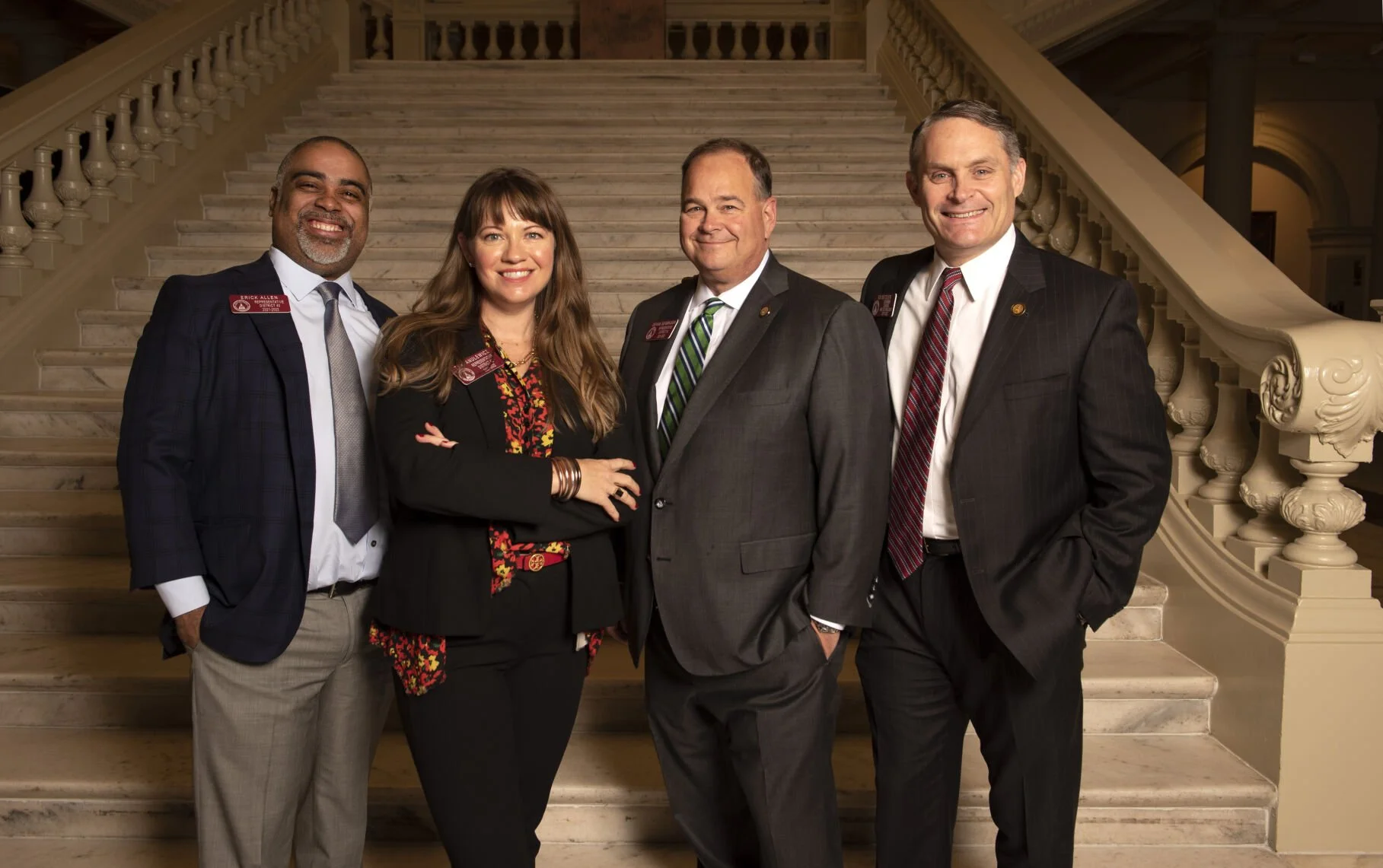 From left: state Reps. Erick Allen, D-Smyrna, Teri Anulewicz, D-Smyrna, Devan Seabaugh, R-Marietta, and Ed Setzler, R-Acworth, pose under the Gold Dome Monday on the first day of the 2022 legislative session.